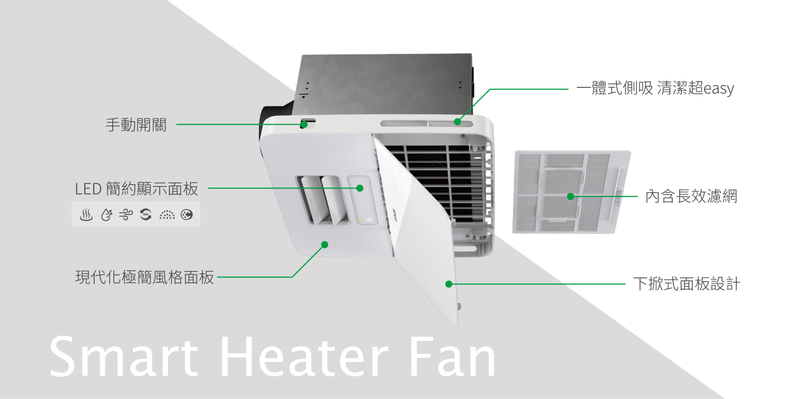 極簡面板,隱藏式側吸排氣設計,將風口貼心的設計於側邊,使灰塵不直接黏著於面板正面,髒汙不外露,保持乾淨美觀。